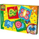 Mozaika z pomponików. W zestawie pomponiki w różnych kolorach: czerwone, niebieski, żółte, pisak oraz kartoniki z obrazkami zwierząt do ozdabiania