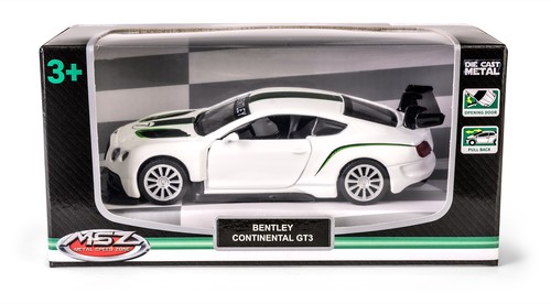 Model metalowy DIE CAST METAL- MSZ Bentley Continental GT3, skala 1:43. Posiada napęd pull-back oraz otwierane drzwi, przez które można zajrzeć do wnętrza samochodu. Metalowy pojazd z elementami plastikowymi wykonany z najwyższą starannością z materiałów wysokiej jakości. Miniaturowe spełnienie marzeń dzięki licencjonowanym modelom aut. Model spełni oczekiwania kolekcjonerów oraz dzieci podczas zabawy. Produkt zgodny z Europejską normą dotyczącą bezpieczeństwa zabawek. Kwalifikacja wiekowa: 3+ Wszystkie pojazdy posiadają oficjalną licencję producenta.