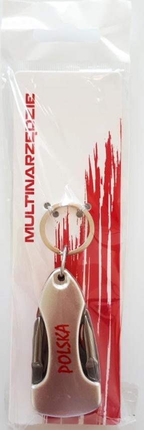 "* multinarzędzie z napisem Polska * posiada funkcję: - latarki - noża - śrubokręta krzyżakowego - śrubokręta płaskiego - otwieracza do butelek * spełnia również funkcję breloka, dzięki czemu może być zawsze „pod rękę” przyczepiony do paska, plecaka, itp. * wymiary: 9cm (z kółkiem breloka) x 3cm x 2cm"