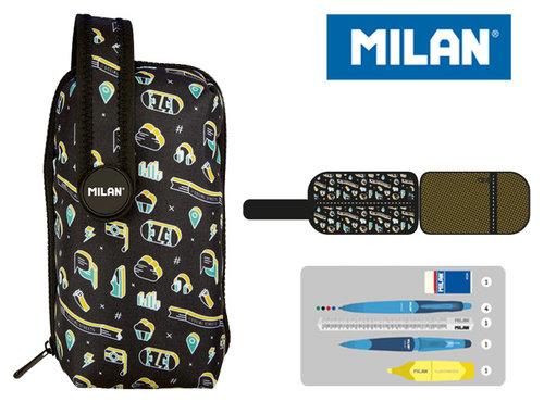 Multipiórnik MILAN owalny z kolekcji ICONS w kolorze czarnym z kolorowym nadrukiem. W środku duży piórnik saszetka z wyposażeniem, który można używać osobno lub jako całość. Dodatkowo kieszonka z siatki zapinana na suwak. Wyposażenie: 4 długopisy CAPSULE, ołówek mechaniczny CAPSULE SLIM, linijka trójkątna 15 cm, zakreślacz CAPSULE, gumka do ścierania. Wymiary:19,4 x 10 x 8 cm. Materiał wierzchni: 100% poliester. Podszewka 150D poliester.