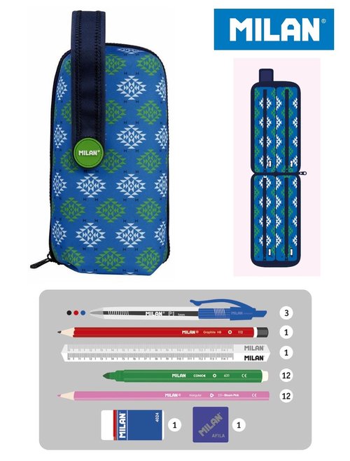 Zestawy kreatywne „MILAN KITS” stworzone specjalnie dla dzieci i z myślą o nich. To seria produktów do rysowania i malowania, które rozwijają kreatywność. Łączą w sobie naukę z zabawą. Idealne do przedszkola, szkoły, ale także w domu, podróży czy na wakacjach. W środku znajdują się 4 piórniki z wyposażeniem przyczepiane na rzepy, które można używać osobno lub jako całość. Wyposażenie: 12 flamastrów ze stożkową końcówką, 12 kredek trójkątnych, 3 długopisy, ołówek HB, temperówka BASIC, 1 gumka syntetyczne MILAN, linijka. Kolekcja: AZTEC Model: 08872AZB Materiał wierzchni: poliester, podszewka: poliester. W multipiórnikach MILAN znajdziesz min.: • Kredki MILAN przy produkcji których użyto drewna pochodzącego wyłącznie z plantacji, gwarantujących nie używanie drewna z lasów deszczowych Rysik kredki na całej długości jest przyklejony do drewna co zapobiega jego łamaniu. Dzięki trójkątnej budowie kredka jest ergonomiczna i wygodnie trzyma się dziecku. • Flamastry MILAN posiadają wytrzymałą i elastyczną stożkową końcówką, która nie wpada do środka nawet przy silnym nacisku. Po chwilowym odkształceniu końcówka zawsze wraca do pierwotnego kształtu. Tusz na bazie wody. Flamastry nie zawierają ftalanów, metali ciężkich i innych substancji toksycznych. Są bezpieczne dla dzieci • Temperówkę z bezpiecznym przykręconym ostrzem dzięki czemu ostrze nie oddzieli się od obudowy temperówki • Trójkątną linijkę • Gumkę z naturalnym kauczukiem