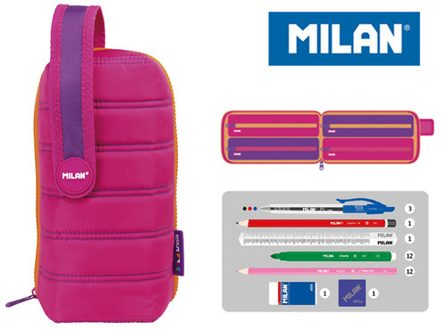Multipiórnik MILAN z kolekcji COLOURS w kolorze różowym. W środku 4 piórniki saszetki z wyposażeniem przyczepiane na rzepy, które można używać osobno lub jako całość. Wyposażenie: 3 długopisy P1, ołówek sześciokątny HB, linijka trójkątna 15 cm, 12 flamastrów, 12 kredek trójkątnych, temperówka, gumka do ścierania. Wymiary: 22,5 x 11,5 x 11 cm. W multipiórnikach MILAN znajdziesz min.: • Kredki MILAN przy produkcji których użyto drewna pochodzącego wyłącznie z plantacji, gwarantujących nie używanie drewna z lasów deszczowych. Rysik kredki na całej długości jest przyklejony do drewna co zapobiega jego łamaniu. Dzięki trójkątnej budowie kredka jest ergonomiczna i wygodnie trzyma się dziecku. • Flamastry MILAN posiadają wytrzymałą i elastyczną stożkową końcówką, która nie wpada do środka nawet przy silnym nacisku. Po chwilowym odkształceniu końcówka zawsze wraca do pierwotnego kształtu. Tusz na bazie wody. Flamastry nie zawierają ftalanów, metali ciężkich i innych substancji toksycznych. Są bezpieczne dla dzieci. • Temperówkę z bezpiecznym przykręconym ostrzem dzięki czemu ostrze nie oddzieli się od obudowy temperówki • Gumkę z naturalnym kauczukiem. Materiał wierzchni: 100% poliester. Podszewka 150D poliester. Zestawy kreatywne "MILAN KITS" stworzone specjalnie dla dzieci i z myślą o nich. To seria produktów do rysowania i malowania, które mają rozwijać kreatywność. Łączą w sobie naukę z zabawą. Idealne do przedszkola, szkoły, ale także w domu, podróży, na wakacjach.