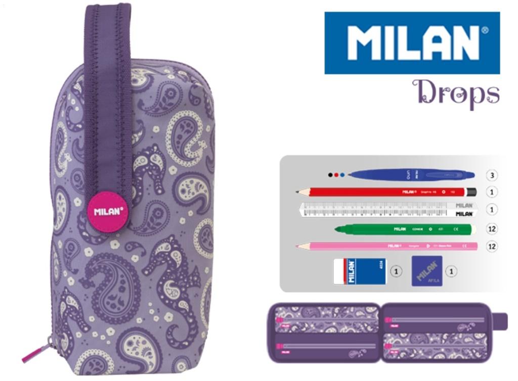 Piórnik MILAN 5 w 1 z wyposażeniem/multipiórnik z kolekcji DROPS w kolorze fioletowym z nadrukiem Multipiórnik składa się z pięciu elementów: 1 dużej saszetki - pokrowca zapinanej na suwak z uchwytem zapinanym na rzep oraz 4 mniejszych piórników-saszetek. W środku znajedziesz 4 piórniki z wyposażeniem przyczepiane na rzepy, które można używać osobno lub jako całość. Wyposażenie: 3 długopisy CAPSULA UNO: niebieski, czerwony, czarny; ołówek sześciokątny HB, linijka trójkątna 15 cm, 12 flamastrów, 12 kredek trójkątnych, temperówka, gumka do ścierania 4024. W multipiórnikach MILAN znajdziesz min.: • Kredki MILAN przy produkcji których użyto drewna pochodzącego wyłącznie z plantacji, gwarantujących nie używanie drewna z lasów deszczowych. Rysik kredki na całej długości jest przyklejony do drewna co zapobiega jego łamaniu. Dzięki trójkątnej budowie kredka jest ergonomiczna i wygodnie trzyma się dziecku. • Flamastry MILAN posiadają wytrzymałą i elastyczną stożkową końcówką, która nie wpada do środka nawet przy silnym nacisku. Po chwilowym odkształceniu końcówka zawsze wraca do pierwotnego kształtu. Tusz na bazie wody. Flamastry nie zawierają ftalanów, metali ciężkich i innych substancji toksycznych. Są bezpieczne dla dzieci. • Temperówkę z bezpiecznym przykręconym ostrzem dzięki czemu ostrze nie oddzieli się od obudowy temperówki • Gumkę z naturalnym kauczukiem. Multipiórnik może być wykorzystywany na wiele sposobów (po wyjęciu wyposażenia), np. jako multikosmetyczka, a duża saszetka - pokrowiec, np. jako torba na drugie śniadanie lub inne drobiazgi. Wymiary: 22,5 x 11,5 x 11 cm. Materiał wierzchni 100% poliester i podszewka 150D poliester. Zestawy kreatywne ""MILAN KITS"" stworzone specjalnie dla dzieci i z myślą o nich. To seria produktów do rysowania i malowania, które mają rozwijać kreatywność. Łączą w sobie naukę z zabawą. Idealne do przedszkola, szkoły, ale także w domu, podróży, na wakacjach.