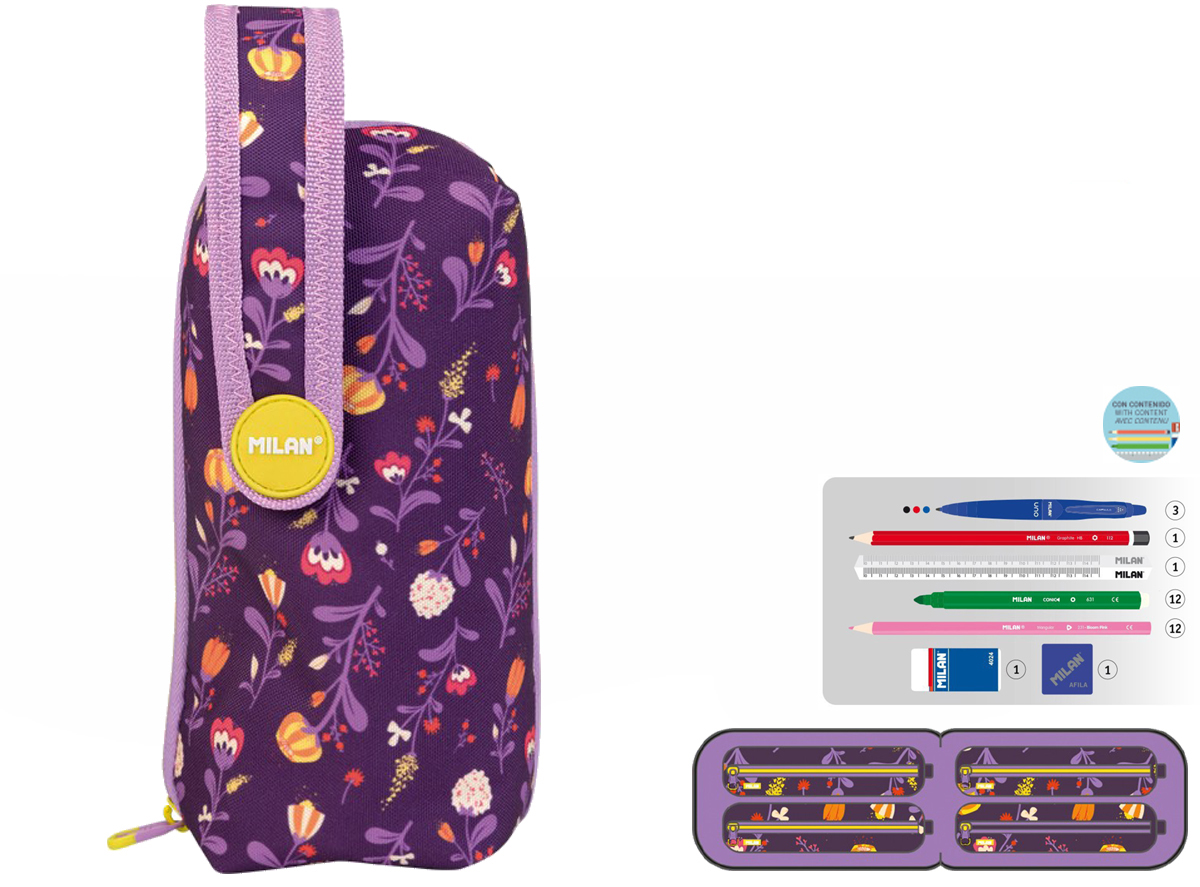 W środku znajdziesz 4 piórniki z wyposażeniem przyczepiane na rzepy, które można używać osobno lub jako całość. Wyposażenie w całości składa się z oryginalnych produktów MILAN: 3 długopisy CAPSULE UNO (niebieski, czarny i czerwony), ołówek sześciokątny HB, linijka trójkątna 15 cm, 12 flamastrów, 12 kredek trójkątnych, temperówka AFILA i gumka do ścierania 4024. Przy produkcji piórników użyto najlepszych materiałów, bardzo wytrzymałych suwaków oraz wzmocnionych nici.