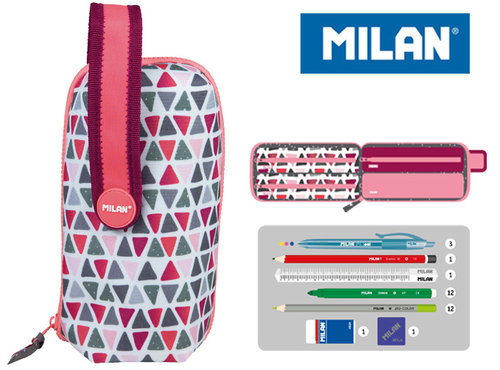W środku 4 piórniki saszetki z wyposażeniem przyczepiane na rzepy, które można używać osobno lub jako całość. Wyposażenie: 3 długopisy P1, ołówek sześciokątny HB, linijka trójkątna 15 cm, 12 flamastrów, 12 kredek trójkątnych, temperówka, gumka do ścierania. Wymiary: 22,5 x 11,5 x 11 cm. W multipiórnikach MILAN znajdziesz min.: • Kredki MILAN przy produkcji których użyto drewna pochodzącego wyłącznie z plantacji, gwarantujących nie używanie drewna z lasów deszczowych. Rysik kredki na całej długości jest przyklejony do drewna co zapobiega jego łamaniu. Dzięki trójkątnej budowie kredka jest ergonomiczna i wygodnie trzyma się dziecku. • Flamastry MILAN posiadają wytrzymałą i elastyczną stożkową końcówką, która nie wpada do środka nawet przy silnym nacisku. Po chwilowym odkształceniu końcówka zawsze wraca do pierwotnego kształtu. Tusz na bazie wody. Flamastry nie zawierają ftalanów, metali ciężkich i innych substancji toksycznych. Są bezpieczne dla dzieci. • Temperówkę z bezpiecznym przykręconym ostrzem dzięki czemu ostrze nie oddzieli się od obudowy temperówki • Gumkę z naturalnym kauczukiem. Materiał wierzchni: 100% poliester. Podszewka 150D poliester. Zestawy kreatywne "MILAN KITS" stworzone specjalnie dla dzieci i z myślą o nich. To seria produktów do rysowania i malowania, które mają rozwijać kreatywność. Łączą w sobie naukę z zabawą. Idealne do przedszkola, szkoły, ale także w domu, podróży, na wakacjach.