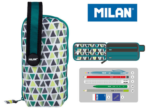 W środku 4 piórniki saszetki z wyposażeniem przyczepiane na rzepy, które można używać osobno lub jako całość. Wyposażenie: 3 długopisy P1, ołówek sześciokątny HB, linijka trójkątna 15 cm, 12 flamastrów, 12 kredek trójkątnych, temperówka, gumka do ścierania. Wymiary: 22,5 x 11,5 x 11 cm. W multipiórnikach MILAN znajdziesz min.: • Kredki MILAN przy produkcji których użyto drewna pochodzącego wyłącznie z plantacji, gwarantujących nie używanie drewna z lasów deszczowych. Rysik kredki na całej długości jest przyklejony do drewna co zapobiega jego łamaniu. Dzięki trójkątnej budowie kredka jest ergonomiczna i wygodnie trzyma się dziecku. • Flamastry MILAN posiadają wytrzymałą i elastyczną stożkową końcówką, która nie wpada do środka nawet przy silnym nacisku. Po chwilowym odkształceniu końcówka zawsze wraca do pierwotnego kształtu. Tusz na bazie wody. Flamastry nie zawierają ftalanów, metali ciężkich i innych substancji toksycznych. Są bezpieczne dla dzieci. • Temperówkę z bezpiecznym przykręconym ostrzem dzięki czemu ostrze nie oddzieli się od obudowy temperówki • Gumkę z naturalnym kauczukiem. Materiał wierzchni: 100% poliester. Podszewka 150D poliester. Zestawy kreatywne "MILAN KITS" stworzone specjalnie dla dzieci i z myślą o nich. To seria produktów do rysowania i malowania, które mają rozwijać kreatywność. Łączą w sobie naukę z zabawą. Idealne do przedszkola, szkoły, ale także w domu, podróży, na wakacjach.