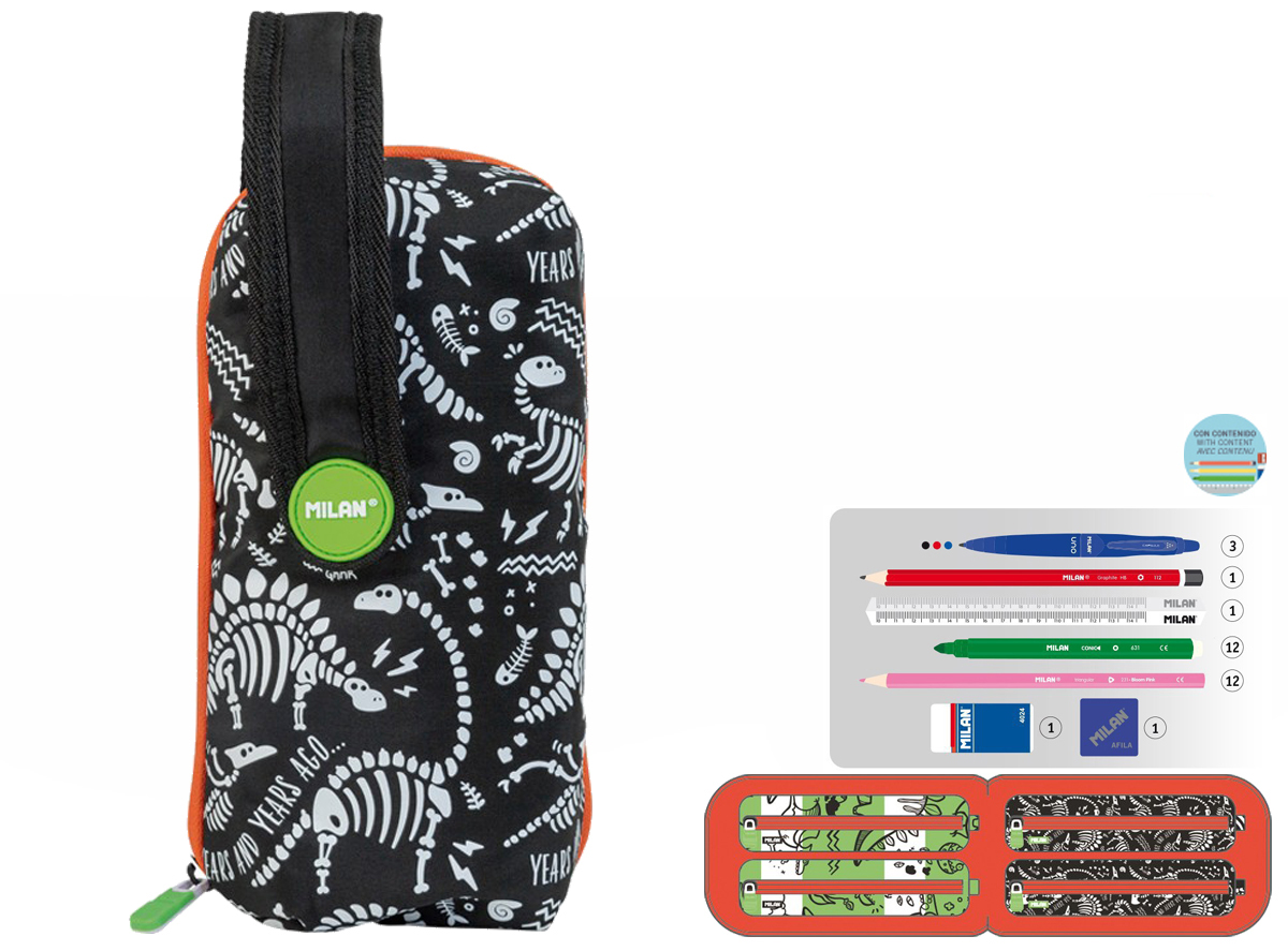 Wyposażenie w całości składa się z oryginalnych produktów MILAN: 3 długopisy CAPSULE UNO (niebieski, czarny i czerwony), ołówek sześciokątny HB, linijka trójkątna 15 cm, 12 flamastrów, 12 kredek trójkątnych, temperówka AFILA i gumka do ścierania 4024. Przy produkcji piórników użyto najlepszych materiałów, bardzo wytrzymałych suwaków oraz wzmocnionych nici.