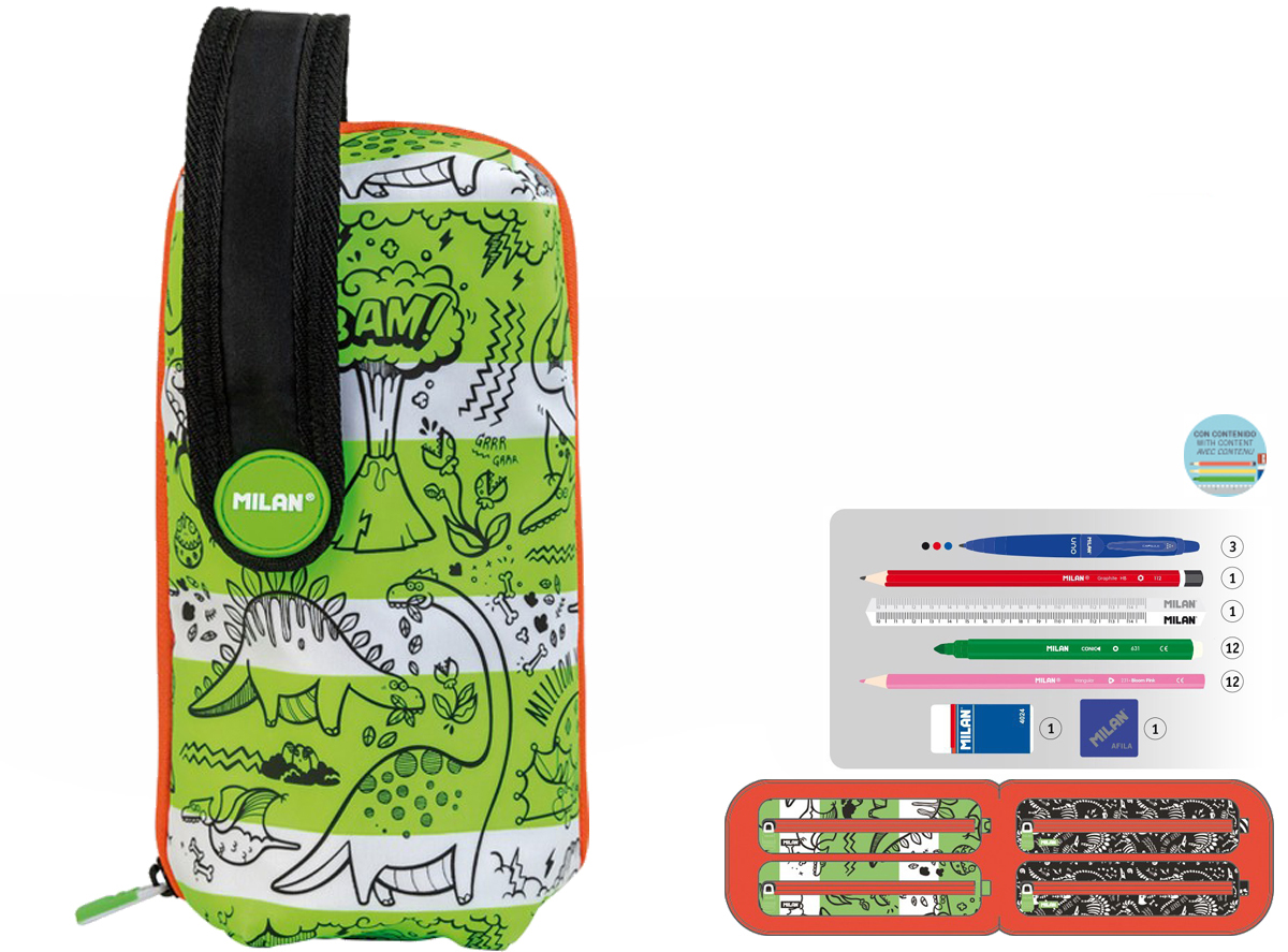 Wyposażenie w całości składa się z oryginalnych produktów MILAN: 3 długopisy CAPSULE UNO (niebieski, czarny i czerwony), ołówek sześciokątny HB, linijka trójkątna 15 cm, 12 flamastrów, 12 kredek trójkątnych, temperówka AFILA i gumka do ścierania 4024.