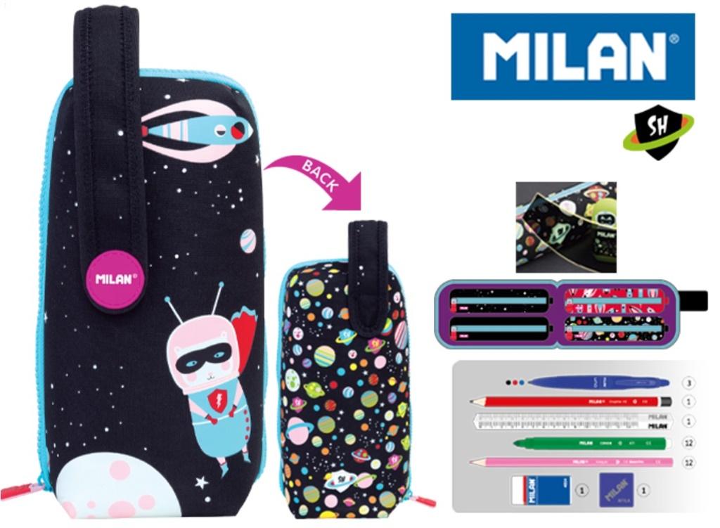 Piórnik MILAN 5 w 1 z wyposażeniem/multipiórnik z kolekcji SUPER HEROES SPACE z kolorowym nadrukiem. NOWOŚĆ: Elementy fluorescencyjne świecące w ciemności. Multipiórnik składa się z pięciu elementów: 1 dużej saszetki - pokrowca zapinanej na suwak z uchwytem zapinanym na rzep oraz 4 mniejszych piórników-saszetek. W środku znajdziesz 4 piórniki z wyposażeniem przyczepiane na rzepy, które można używać osobno lub jako całość. Wyposażenie: 3 długopisy CAPSULA UNO: niebieski, czerwony, czarny; ołówek sześciokątny HB, linijka trójkątna 15 cm, 12 flamastrów, 12 kredek trójkątnych, temperówka, gumka do ścierania 4024. W multipiórnikach MILAN znajdziesz min.: • Kredki MILAN przy produkcji których użyto drewna pochodzącego wyłącznie z plantacji, gwarantujących nie używanie drewna z lasów deszczowych. Rysik kredki na całej długości jest przyklejony do drewna co zapobiega jego łamaniu. Dzięki trójkątnej budowie kredka jest ergonomiczna i wygodnie trzyma się dziecku. • Flamastry MILAN posiadają wytrzymałą i elastyczną stożkową końcówką, która nie wpada do środka nawet przy silnym nacisku. Po chwilowym odkształceniu końcówka zawsze wraca do pierwotnego kształtu. Tusz na bazie wody. Flamastry nie zawierają ftalanów, metali ciężkich i innych substancji toksycznych. Są bezpieczne dla dzieci. • Temperówkę z bezpiecznym przykręconym ostrzem dzięki czemu ostrze nie oddzieli się od obudowy temperówki • Gumkę z naturalnym kauczukiem. Multipiórnik może być wykorzystywany na wiele sposobów (po wyjęciu wyposażenia), np. jako multikosmetyczka, a duża saszetka - pokrowiec, np. jako torba na drugie śniadanie lub inne drobiazgi. Wymiary: 22,5 x 11,5 x 11 cm. Materiał wierzchni 100% poliester i podszewka 150D poliester. Zestawy kreatywne ""MILAN KITS"" stworzone specjalnie dla dzieci i z myślą o nich. To seria produktów do rysowania i malowania, które mają rozwijać kreatywność. Łączą w sobie naukę z zabawą. Idealne do przedszkola, szkoły, ale także w domu, podróży, na wakacjach.