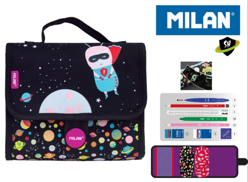 Multipiórnik MILAN z kolekcji SUPER HEROES SPACE z kolorowym nadrukiem. NOWOŚĆ: Elementy fluorescencyjne świecące w ciemności. W środku 2 piórniki saszetki owalne z wyposażeniem przyczepiane na rzepy, które można używać osobno lub jako całość. Dodatkowo kieszonka z siatki Wyposażenie: 3 długgopisy CAPSUEA UNO, ołówek sześciokątny HB, linijka trójkątna 15 cm, 18 flamastrów, 12 kredek trójkątnych, temperówka, 2 gumki do ścierania. W multipiórnikach MILAN znajdziesz min.: • Kredki MILAN przy produkcji których użyto drewna pochodzącego wyłącznie z plantacji, gwarantujących nie używanie drewna z lasów deszczowych. Rysik kredki na całej długości jest przyklejony do drewna co zapobiega jego łamaniu. Dzięki trójkątnej budowie kredka jest ergonomiczna i wygodnie trzyma się dziecku. • Flamastry MILAN posiadają wytrzymałą i elastyczną stożkową końcówką, która nie wpada do środka nawet przy silnym nacisku. Po chwilowym odkształceniu końcówka zawsze wraca do pierwotnego kształtu. Tusz na bazie wody. Flamastry nie zawierają ftalanów, metali ciężkich i innych substancji toksycznych. Są bezpieczne dla dzieci. • Temperówkę z bezpiecznym przykręconym ostrzem dzięki czemu ostrze nie oddzieli się od obudowy temperówki • Gumkę z naturalnym kauczukiem. Wymiary: 22 x 20,5 x 9 cm. Materiał wierzchni: 100% poliester. Podszewka 150D poliester. Zestawy kreatywne ""MILAN KITS"" stworzone specjalnie dla dzieci i z myślą o nich. To seria produktów do rysowania i malowania, które mają rozwijać kreatywność. Łączą w sobie naukę z zabawą. Idealne do przedszkola, szkoły, ale także w domu, podróży, na wakacjach.