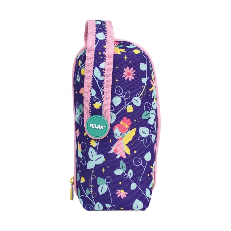 Piórnik 5 w 1 z wyposażeniem/multipiórnik. Kolekcja FAIRY TALE przedstawia las winorośli zamieszkany przez magiczne wróżki. Nadruk w tonacji turkusowej, żółtej i różowej na ciemnofioletowym tle.