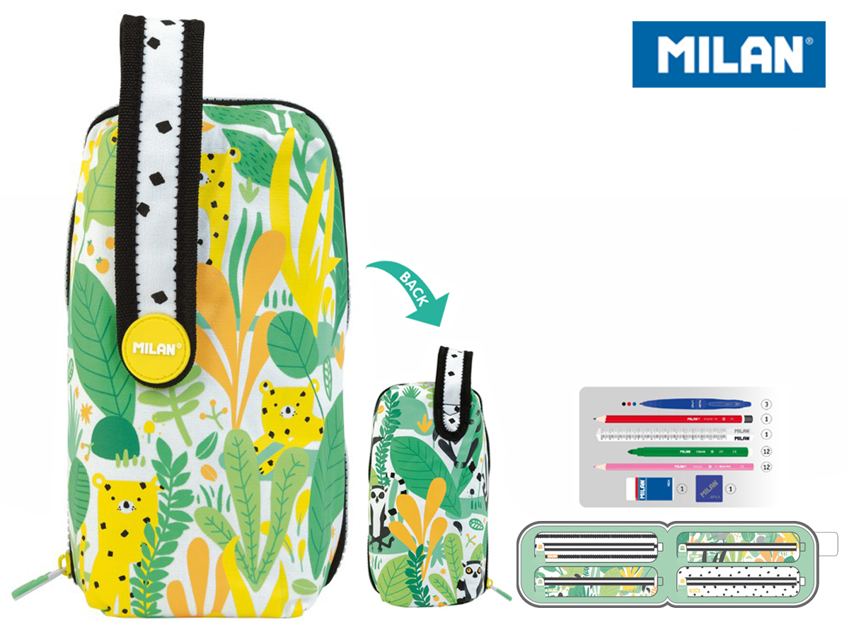 Piórnik MILAN 5 w 1 z wyposażeniem/multipiórnik z kolekcji HYDE & SEEK w kolorze zielono-żółtym. Multipiórnik składa się z pięciu elementów: 1 dużej saszetki - pokrowca zapinanej na suwak z uchwytem zapinanym na rzep oraz 4 mniejszych piórników-saszetek. W środku znajedziesz 4 piórniki z wyposażeniem przyczepiane na rzepy, które można używać osobno lub jako całość. Wyposażenie: 3 długopisy CAPSULA UNO (niebieski, czarny i czerwony), linijka trójkątna 15 cm, 12 flamastrów, 12 kredek trójkątnych, temperówka, gumka do ścierania 4024. W multipiórnikach MILAN znajdziesz min.: • Kredki MILAN przy produkcji których użyto drewna pochodzącego wyłącznie z plantacji, gwarantujących nie używanie drewna z lasów deszczowych. Rysik kredki na całej długości jest przyklejony do drewna co zapobiega jego łamaniu. Dzięki trójkątnej budowie kredka jest ergonomiczna i wygodnie trzyma się dziecku. • Flamastry MILAN posiadają wytrzymałą i elastyczną stożkową końcówką, która nie wpada do środka nawet przy silnym nacisku. Po chwilowym odkształceniu końcówka zawsze wraca do pierwotnego kształtu. Tusz na bazie wody. Flamastry nie zawierają ftalanów, metali ciężkich i innych substancji toksycznych. Są bezpieczne dla dzieci. • Temperówkę z bezpiecznym przykręconym ostrzem dzięki czemu ostrze nie oddzieli się od obudowy temperówki • Gumkę z naturalnym kauczukiem. Multipiórnik może być wykorzystywany na wiele sposobów (po wyjęciu wyposażenia), np. jako multikosmetyczka, a duża saszetka - pokrowiec, np. jako torba na drugie śniadanie lub inne drobiazgi. Wymiary: 22,5 x 11,5 x 11 cm. Materiał: bawełniana strona zewnętrzna i podszewka z poliestru. Zestawy kreatywne "MILAN KITS" stworzone specjalnie dla dzieci i z myślą o nich. To seria produktów do rysowania i malowania, które mają rozwijać kreatywność. Łączą w sobie naukę z zabawą. Idealne do przedszkola, szkoły, ale także w domu, podróży, na wakacjach.
