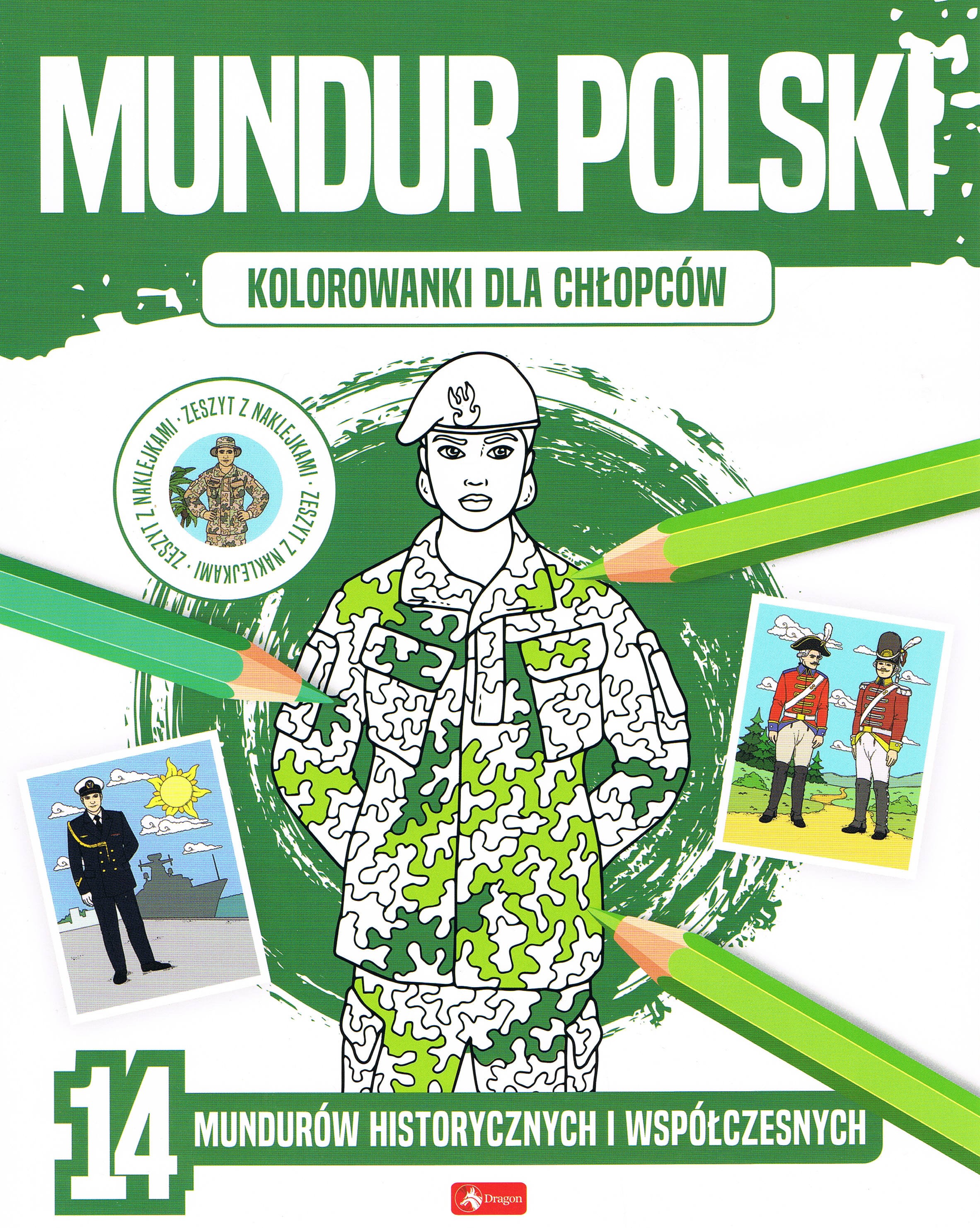 KOLOROWA HISTORIA POLSKIEGO ŻOŁNIERSKIEGO MUNDURU Oto nie lada gratka dla chłopców - czternaście kolorowanek z mundurami polskich żołnierzy. Sześć współczesnych i osiem historycznych wzorów różnych formacji, od piechoty, przez marynarkę, po lotnictwo. Współczesne mundury służbowe, galowe, polowe, wyjściowe i tropikalne, mundury kawalerzystów i marynarzy z 1939 roku, Samodzielnej Brygady Strzelców Karpackich z lat 1940-1942, odrodzonego Wojska Polskiego z lat 1944-1945, a także znane już tylko z zamierzchłych czasów, XVIII- i XIX-wieczne, bajecznie kolorowe stroje ułanów, grenadierów i woltyżerów. Kolorowanie ułatwią barwne naklejki. KREDKI W DŁOŃ I NAPRZÓD MARSZ!