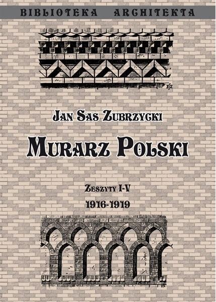 Murarz Polski . Wzory i przykłady polskiego budownictwa ceglanego dla odbudowy kraju. - Jan Sas Zubrzycki Zbiór 5 zeszytów autorstwa Jana Sasa Zubrzyckiego wydanych w latach 1916-1919. Tytuł ten stanowi uzupełnienie ""Cieślictwa polskiego"" oraz ""Polskiego budownictwa drewnianego"". Zubrzycki ukazuje wzory sztuki budowlanej wywodzące się ze sztuki ludowej oraz dworskiej i mieszczańskiej, tradycyjne polskie wykończenia i zabudowy. Na 40 tablicach zostały objaśnione i przedstawione przykłady planów i rzutów domów i chat polskich, murowanych oraz wzory łuków, sklepień, filarów podcieni, wykorzystania materiałów. Obiekty przedstawione na rysunkach w większości już nie istnieją.