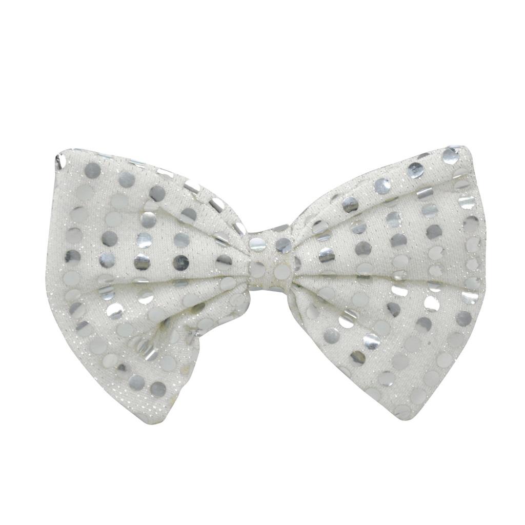 Błyszcząca muszka w kolorze srebrnym. Mucha zdobiona jest połyskującymi kropeczkami. Mocowanie za pomocą elastycznej gumeczki zapewnia wygodne noszenie oraz zakładanie. Zabawny element stylizacji na zabawę karnawałową, imprezę tematyczną, przyjęcie w stylu disco. Muszka o wymiarze 14x9 cm.