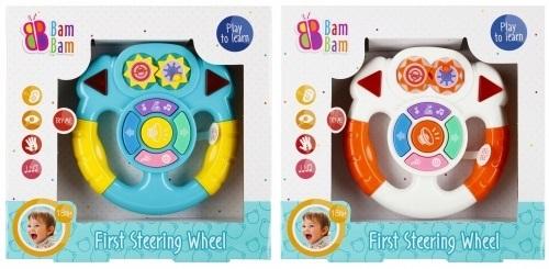 Interaktywna zabawka muzyczna Kierownica BAM BAM wprowadzi malucha w świat doznań muzycznych, oferując mu zróżnicowane melodie, dźwięki i piosenki. Naciskaniu klawiszy towarzyszy jednocześnie mruganie kolorowych światełek w rytm linii melodycznej, uatrakcyjniając zabawę. Poprzez możliwość samodzielnego wyboru przycisków maluch uczy się rozróżniania dźwięków, zapamiętywania ich, logicznego ciągu przyczyna skutek, a jednocześnie stymuluje zmysły, zdolności manualne i motorykę. Dzięki poręcznym rączkom, zabawka jest łatwa w chwytaniu i trzymaniu przez mała rączkę. Zabawka Kierownica występuje w dwóch kolorach: białym, niebieskim. Przeznaczona dla dzieci w wieku 18m+. Wymiary/waga/baterie: wymiary produktu (dł. x wys. x gł.)[kg]: 15x15x3 wymiary opakowania (dł. x wys. x gł.)[cm]: 24x23x5, waga produktu bez opakowania [kg]:0,20 kg, waga produktu w opakowaniu [kg]: 0,26 kg, wymaga zasilania bateriami 2 x AALR06- załączono do zestawu. Zabawka pakowana w kartonik z otwartym okienkiem.