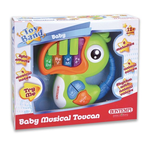 Muzyczny tukan. Zabawka posiada 6 wgranych melodii oraz 4 nuty muzyczne, a także 4 zwierzęce dźwięki. Po naciśnięciu odpowiednich przycisków uruchamiają się efekty świetlne oraz melodie ze zwierzęcymi odgłosami. Tukan automatycznie się wyłącza, gdy nie jest używana. Zabawka zasilana 2 bateriami AAA, które nie są dołączone do zestawu. Dla dzieci w wieku od 12 miesięcy