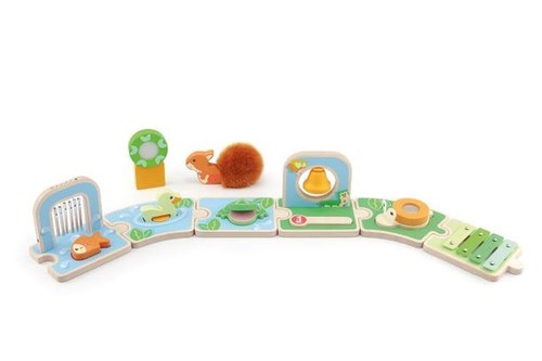 Muzyczna zabawka - Jeziorko z systemem sorterowym. Działa jako typowa układanka, daje możliwość rozwoju wyobraźni dziecka oraz budowy ścieżek według własnego pomysłu. Ksylofon, dzwonki wietrzne, grzechotka, dzwonek, piszczałka, cymbałki. Wiek: 2+