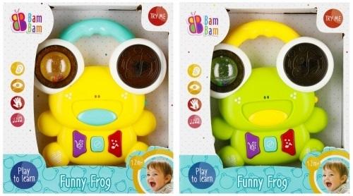 Interaktywna zabawka muzyczna ZABAWNA ŻABKA BAM BAM wprowadzi malucha w świat doznań muzycznych, oferując mu zróżnicowane melodie, dźwięki i piosenki. Naciskaniu klawiszy towarzyszy jednocześnie mruganie kolorowych światełek-oczu żabki w rytm linii melodycznej, uatrakcyjniając zabawę. Poprzez możliwość samodzielnego wyboru przycisków maluch uczy się rozróżniania dźwięków, zapamiętywania ich, logicznego ciągu przyczyna skutek, a jednocześnie stymuluje zmysły, zdolności manualne i motorykę. Dzięki poręcznej rączce, zabawka jest łatwa w chwytaniu i trzymaniu przez mała rączkę. Zabawka Żabka występuje w dwóch kolorach zielonym, żółtym. Przeznaczona dla dzieci w wieku 12m+. Wymiary/waga/baterie: wymiary produktu (dł. x wys. x gł.)[kg]: 13x15x4, wymiary opakowania (dł. x wys. x gł.)[cm]: 17x19x5, waga produktu bez opakowania [kg]:0,16 kg, waga produktu w opakowaniu [kg]: 0,21 kg, wymaga zasilania bateriami 2 x AALR06- załączono do zestawu. Zabawka pakowana w kartonik z otwartym okienkiem.