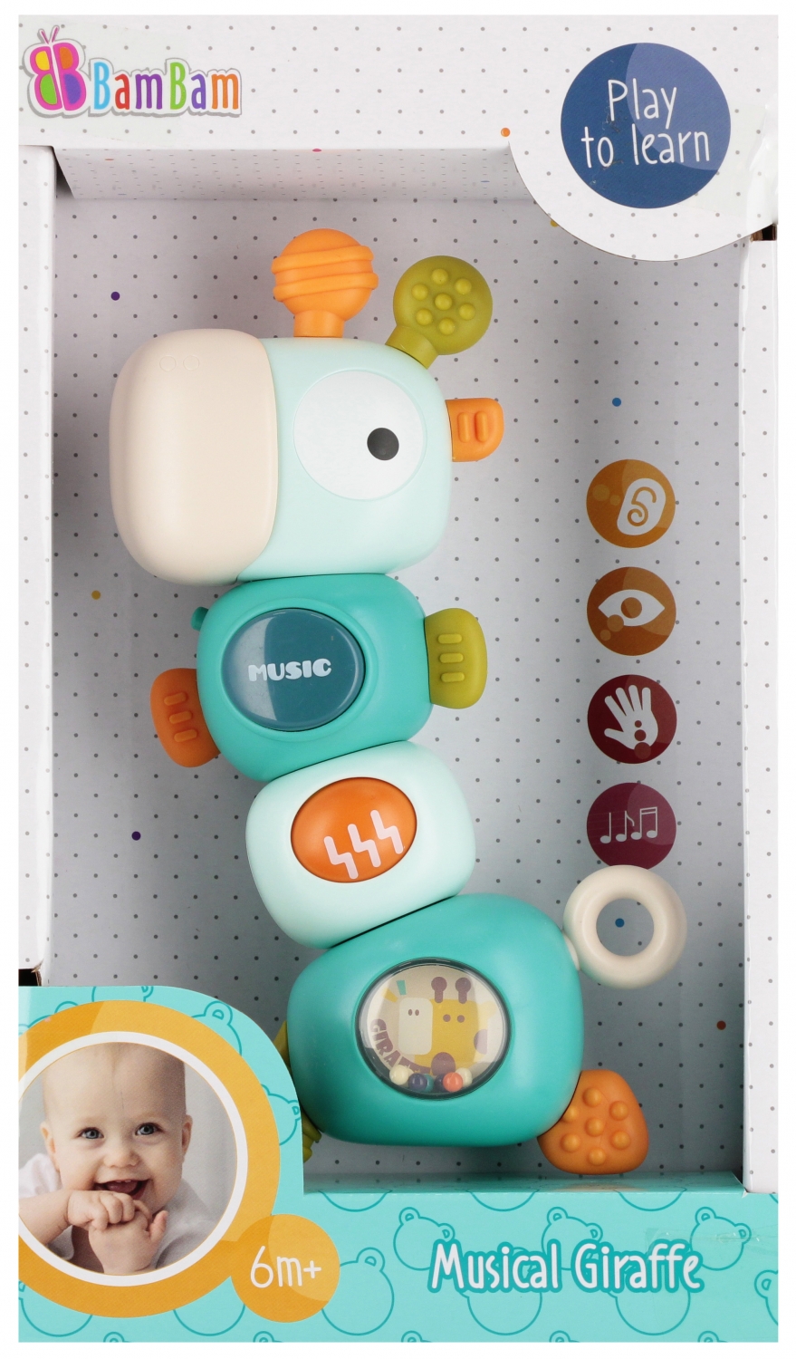 Muzyczna Żyrafka BAM BAM. Kolorowa Muzyczna Żyrafka to radosna zabawka, która łączy dźwięki, światła i ruch, dostarczając dziecku mnóstwo frajdy. Dzięki interaktywnym funkcjom maluch poznaje pierwsze melodie, rozwija poczucie rytmu i odkrywa świat muzyki poprzez zabawę. Zabawka wspiera rozwój słuchu i poczucie rytmu, zachęca do ruchu i tańca, rozwija koordynację ręka oko, pobudza ciekawość i wyobraźnię, uczy przyczynowo skutkowego myślenia ( dźwięk/światło).