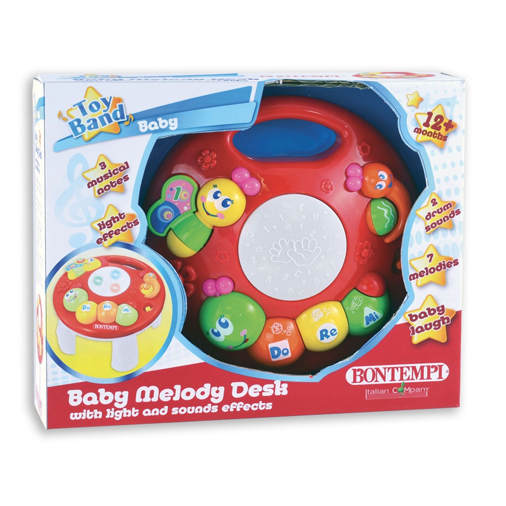Muzyczne biurko przedszkolaka, które zaiwera 7 wcześniej wgranych melodii, 3 nuty muzyczne oraz 2 dźwięki perkusji.