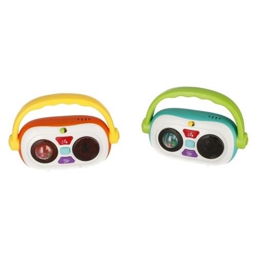 Interaktywna zabawka muzyczna ZABAWNE RADYJKO BAM BAM wprowadzi malucha w świat doznań muzycznych, oferując mu zróżnicowane melodie, dźwięki i piosenki. Naciskaniu klawiszy towarzyszy jednocześnie mruganie kolorowych światełek w rytm linii melodycznej, uatrakcyjniając zabawę. Potrząsanie i obracanie jednego z głośników, wprawia w ruch bajecznie kolorowe kuleczki , znajdujące się we wnętrzu kuli, które obijając się o siebie wzajemnie i ścianki, wydają grzechoczące dźwięki. Poprzez możliwość samodzielnego wyboru przycisków maluch uczy się rozróżniania dźwięków, zapamiętywania ich, logicznego ciągu przyczyna skutek, a jednocześnie stymuluje zmysły, zdolności manualne i motorykę. Dzięki poręcznej rączce, która przy przekręcaniu wydaje zabawny dźwięk, zabawka jest łatwa w chwytaniu i trzymaniu przez mała rączkę. Wymiary/waga/baterie: wymiary produktu (dł. x wys. x gł.)[kg]: 18x13x5, wymiary opakowania (dł. x wys. x gł.)[cm] 21x16x6, waga produktu bez opakowania [kg]:0,21 kg, waga produktu w opakowaniu [kg]: 0,25 kg, wymaga zasilania bateriami 2 x AALR06- załączono do zestawu.Przeznaczona dla dzieci w wieku 12m+. Zabawka pakowana w kartonik z otwartym okienkiem.