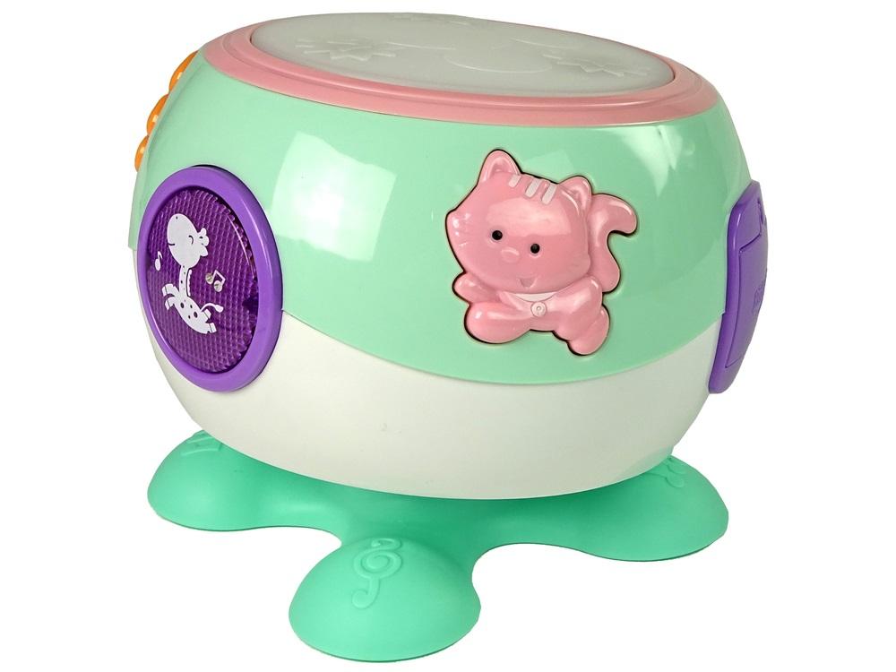 Muzyczny Bębenek Melodie Światła Piosenki Zwierzątka Turkusowy Interaktywna zabawka, w postaci bębenka, dla maluszków zapewni mnóstwo wesołej zabawy każdemu dziecku. Na zabawce przedstawione są zwierzątka. Zabawka wykonana jest z plastiku, w uroczych kolorowych barwach. Membrana perkusji wykonana jest z miękkiego materiału, dzięki czemu dziecko będzie mogło bezpiecznie w nią uderzać. Zabawka pozytywnie wpływa na rozwój dziecka. Dzieci poznają kształty i kolory. Przez pierwszy dotyk, odkrywają otaczający ich świat i doskonalą swoje umiejętności. Zachęci do poprawiania motoryki, uczy nowych ruchów oraz umiejętności. Niekończąca się zabawa w rytm melodii. Cechy charakterystyczne zabawki: - bębenek obraca się o 360 stopni - małpka odtwarza historię w języku angielskim - okrągły przycisk z żyrafą- odtwarza odgłosy zwierząt ( koń, kot, małpka, żaba, ptaszek, kaczka) - trójkąt odtwarza różne piosenki w języku angielskim - kotek wymienia 26 liter po angielsku - piesek posiada aż 100 różnych melodii np: Happy Birthday - białe i żółte światło miga wraz z muzyką - diody (czerwona, zielona, niebieska) wewnątrz górnej części bębenka pulsują wraz z muzyką Zabawka zawiera instrukcje i rozpiskę utworów w języku angielskim. Pielęgnuj w swoim dziecku zmysł muzyczny! Baw się z nim i pokaż mu świat! Wymiary bębenka: - średnica: 22 cm - wysokość:17 cm Wymiary pudełka: 21 cm x 21 cm x 21 cm Zabawka przeznaczona jest dla dzieci powyżej 12 miesiąca życia. Do uruchomienia zabawki potrzeba 3 baterii AAA 1.5V (brak w zestawie). Bębenek interaktywny jest zapakowany w kartonowe pudełko, dzięki czemu idealnie nadaje się na prezent dla nowego członka rodziny.