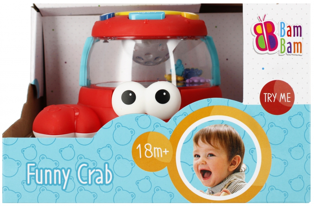 Muzyczny Krabik  aktywizuje rozwój maluszka od ok. 18 m-ca na wielu płaszczyznach. Kolorowe przyciski na pancerzu wygrywają różnorodne dźwięki, w tym melodie, dźwięki instrumentów muzycznych czy kojący szum fal, ucząc ich rozpoznawania oraz rozwijając zmysł słuchu. Przy potrząsaniu krabika bajecznie kolorowe, małe krabiki grzechoczą w środku pancerza, dostarczając jednocześnie doznań wizualnych, wspierających rozwój zmysłu wzroku. Chwytanie, manewrowanie krabikiem, przyciskanie kolorowych guziczków angażuje uwagę dziecka, uczy skupienia i koncentracji, a jednocześnie usprawnia zdolności manualne i motorykę małą. Wymiary/waga/baterie wymiary produktu dł. x wys. x gł. kg 13x8x10, wymiary opakowania dł. x wys. x gł. cm 16x10x13, waga produktu bez opakowania kg 0,12 kg, waga produktu w opakowaniu kg 0,19 kg, wymaga zasilania bateriami 2 x AAALR03- załączono do zestawu. Zabawka pakowana w kartonik z otwartym okienkiem.