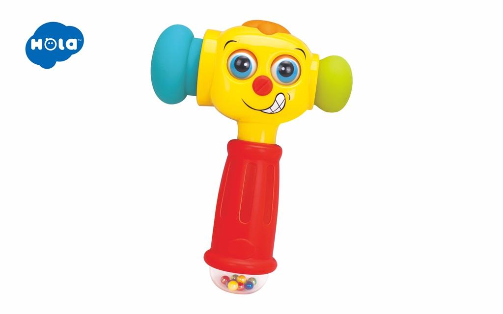 Grzechotka w kształcie młotka, której zmieniają się oczy przy naciśnięciu uszu.