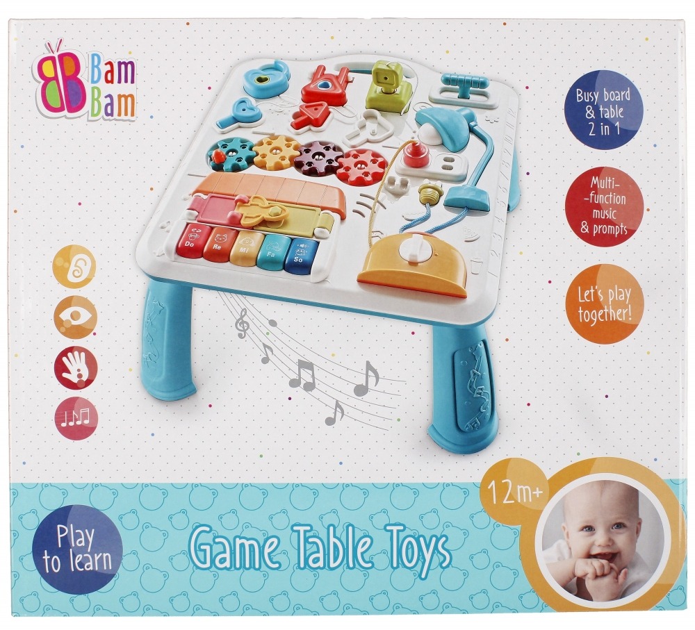 Interaktywny Muzyczny STOLICZEK EDUKACYJNY, zabawka spełniająca funkcję- edukacyjną, melodyjną i naukową, na każdy etap rozwoju dziecka. Zróżnicowana faktura i materiały, w tym ruchome elementy oraz mrugające przyciski, małe pianinko wygrywające różne melodie, muzyczne elementy ukrywające przeróżne odgłosy czy melodyjki ,dostarczają szeregu bodźców, aktywizując wszechstronny rozwój dziecka, począwszy od zmysłów poprzez zdolności manualne, motoryczne oraz percepcję i wyobraźnię Stolik muzyczny posiada wiele możliwości zabawy tj.: poznawanie odgłosów zwierzątek, zdolności ruchowe poprzez elementy ruchome umieszczone na blacie stoliczka, umiejętność dopasowywania odpowiednich kształtów. Wymiary/waga/baterie: wymiary produktu (dł. x wys. x gł.)[cm]:39x24x39, wymiary opakowania (dł. x wys. x gł.)[cm]: 40x35x9, waga produktu bez opakowania [kg]:1,01 kg, waga produktu w opakowaniu [kg]: 1,24 kg. Zabawka przeznaczona dla dzieci w wieku: 12M+. Wymaga zasilania bateriami 3x AALR06- załączone do zestawu. Zestaw pakowany w kartonik.