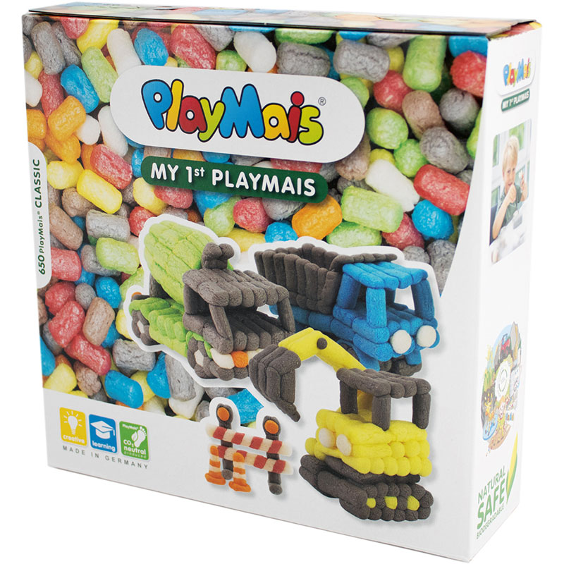 MY FIRST PlayMais to klocki w postaci chrupek ze skrobi kukurydzianej, które można łączyć ze sobą za pomocą niewielkiej ilości wody. Ten zestaw umożliwia zbudowanie dzieciom figurek i wzorów związanych z placem budowy i nie tylko.
