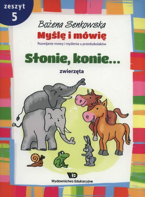 Seria zeszytów z ćwiczeniami dla dzieci w wieku od 3 do 5 lat. Zeszyty mogą być pomocne specjalistom pracującym z dziećmi w poradniach psychologiczno-pedagogicznych, nauczycielom przedszkoli, a także rodzicom. Każdy z zeszytów obejmuje inny blok tematyczny. Celem nadrzędnym wszystkich ćwiczeń jest rozwijanie jednocześnie mowy i myślenia dziecka, adekwatnie do jego możliwości poznawczych i percepcyjnych. Niektóre ćwiczenia zwracają uwagę dziecka na dźwiękową strukturę słowa (rym, długość słów). Ćwiczenia przedstawione są w kolorowej szacie graficznej, z kolei strony czarno-białe wymagają od dziecka jego twórczej aktywności.Zeszyt 5 - Słonie, konie... Zwierzęta
