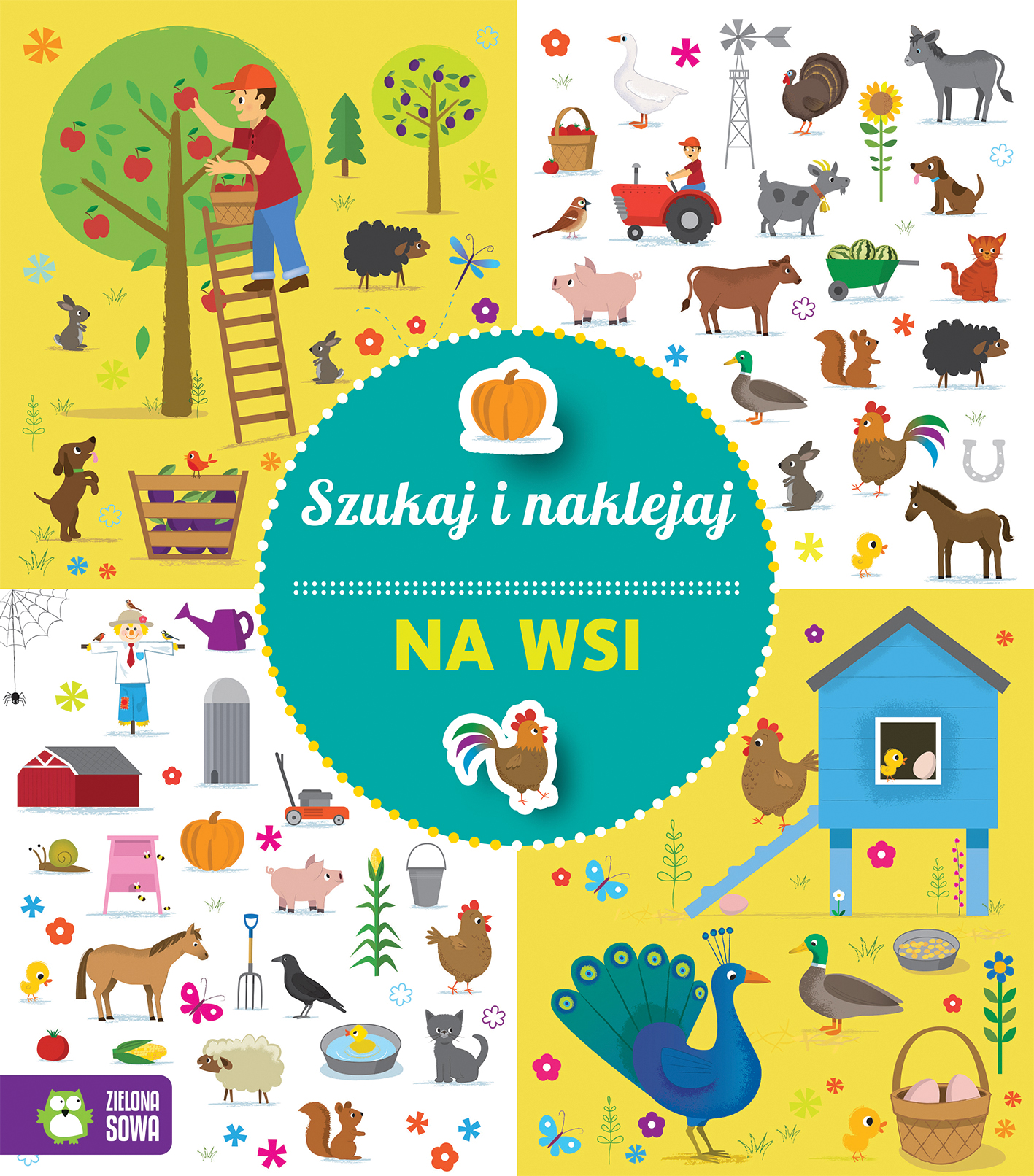 Kaczki, kury, koń, krowa i królik sprawdź, czy znajdziesz wszystkie zwierzęta na obrazku! Książeczki z kolorowymi ilustracjami i naklejkami. Dziecko poznaje pojazdy, zwierzęta, życie na wsi i przeróżne sprzęty, które można zobaczyć w domu. Na każdej stronie jest mnóstwo elementów do odszukania na dużej ilustracji. Dziecko odpowiada na zamieszczone obok niej pytania i przykleja naklejki we właściwych miejscach.