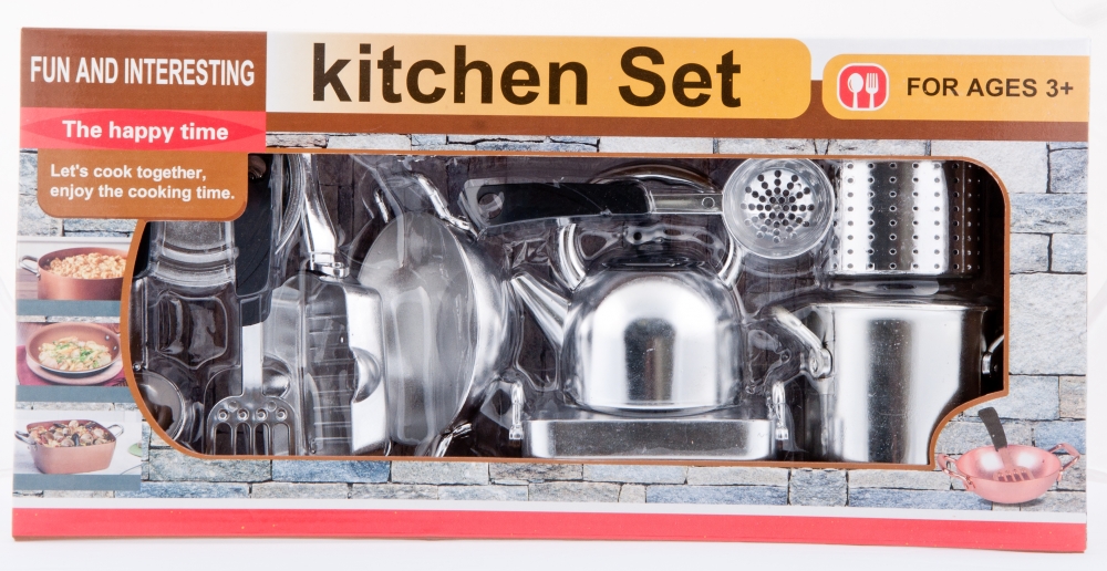 W zestawie znajdują się czajnik, taca, patelnia do grillowania, chochelka, łyżka do makaronu oraz łyżka cedzakowa, podbierak, garnek wok, garnek z pokrywką do odcedzania. Zabawka pakowana w pudełko.