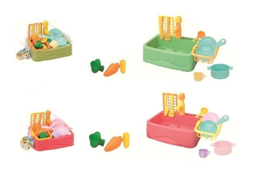 Zestaw umywalka z kranem oraz suszarką. Tutaj będzie można umyć naczynia, a także je osuszyć. W zestawie są także również naczynia jak garnek, rondelek, kubek oraz warzywa. Produkt występuke w kilku wersjach kolorystycznych, wybierany losowo. Cena dotyczy jednej sztuki. Zabawka zapakowana w worek z siateczki. Podane wymiary sa przybliżonymi wymiarami zabawki w opakowaniu.