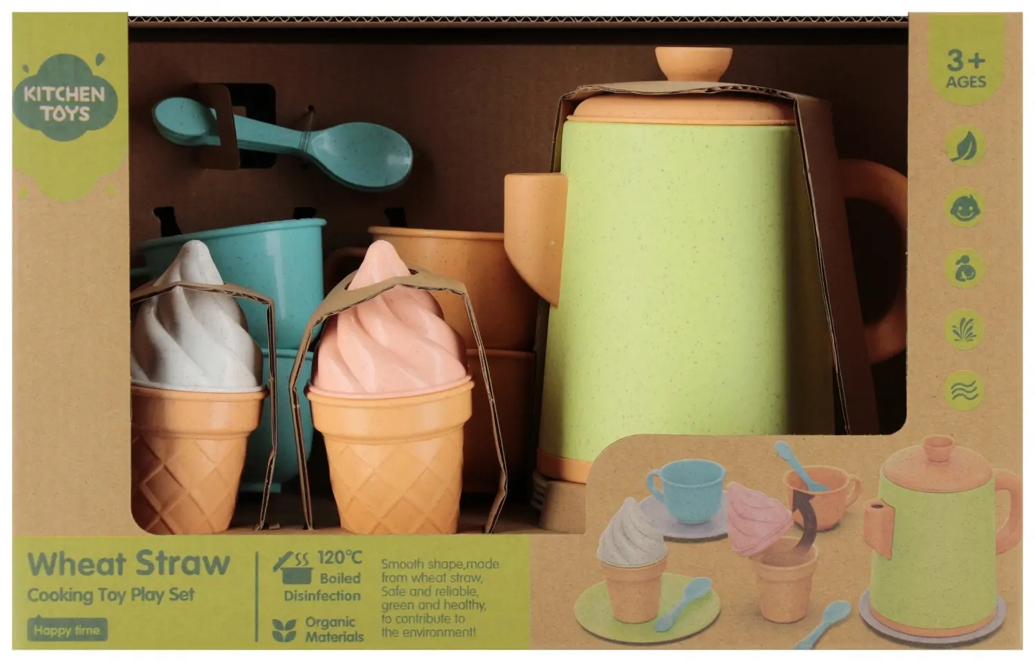 Produkt wykonany z plastiku. Zawartość zestawu: 1x dzbanek, 2x lód rożek, 4x talerzyk, 4x kubeczek, 4x łyżeczka.