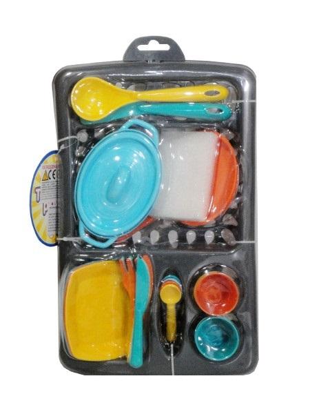 Zestaw naczyń z suszarką. Kubki, sztućce, garnek, talerze, patelnia, gąbka do naczyń umieszczone w suszarce dodadzą realizmu i frajdy podczas zabawy. A wszystko to w miłych dla oka kolorach. Produkt przykryty przezroczystym kloszem. Zabawka dla dzieci od 3 lat.