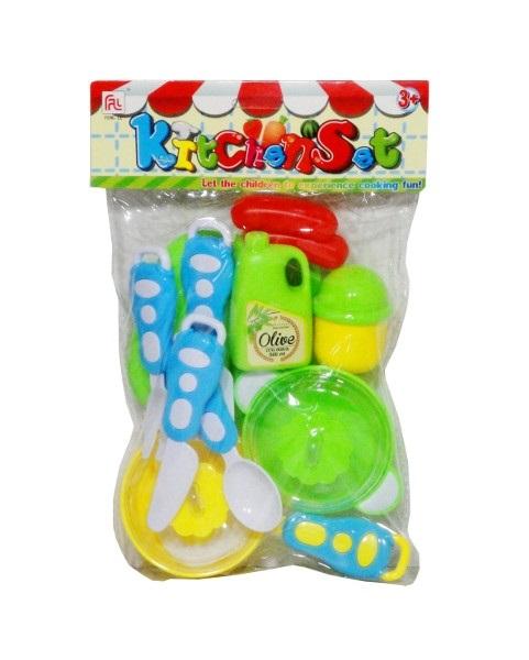 Zestaw plastikowych akcesorii kuchennych. W zestawie można znaleźć: garnek (z przykrywką), patelnię (z przykrywką), deska, sztućce, oliwę i przyprawnik.Produkt zapakowany w przezroczysty worek.Podane wymiary sąwymiarami opakowania.Zabawka przeznaczona dla dzieci od 3 lat.