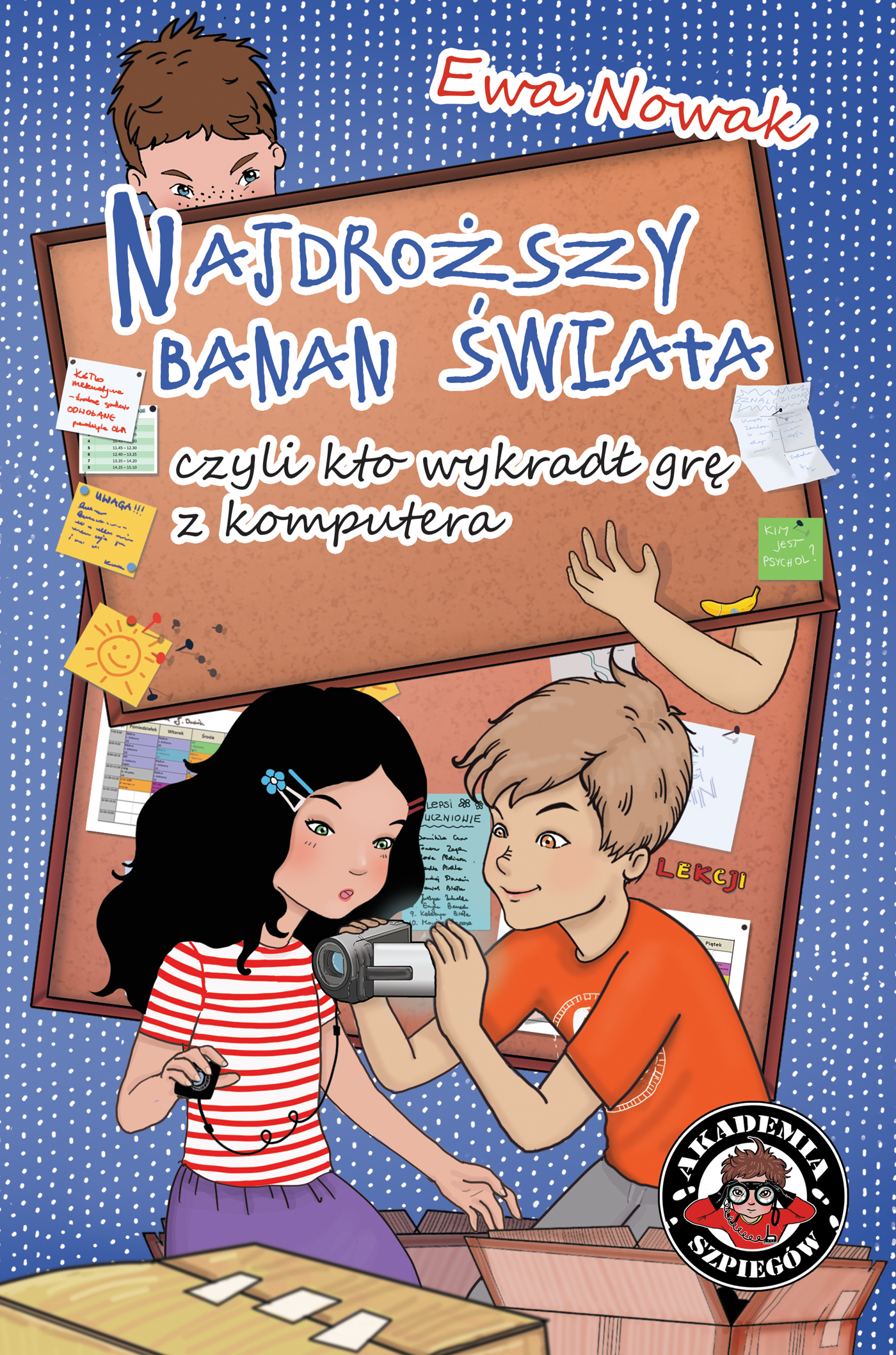Pełna humoru historia szpiegowska z udziałem Mieszka, Marceliny i Franka (kryptonimy Anakin, Omega i Czternasty), którzy starają się rozwiązać aż dwie zagadki. Czy uda im się odkryć, kto wykradł grę komputerową oraz ile wart jest najdroższy banan świata? Na szczęście młodzi bohaterowie mają doświadczenie – przekazywanie tajnych informacji, śledzenie innych czy działanie pod przykrywką to dla nich nie pierwszyzna. Wyposażeni są także w pełen zestaw odpowiednich materiałów – na przykład lalki w ciąży lub kucyki Pony (bardzo przydatne w pracy szpiega!). Nie ma więc z nimi szans nawet dyrektor czy szkolna psycholożka (czyżby też byli w szajce?). Lepiej uważajcie – z tą grupą operacyjną nie ma żartów. To druga książka z serii Akademia Szpiegów. Sprawdź też inne przygody młodych szpiegów w książce Noga w szufladzie, czyli domowa historia szpiegowska. Musiałem jak najszybciej pozbyć się przesyłki. Operacja „Śluza” przebiegała zgodnie z planem. Mojego łącznika zobaczyłem od razu. Szybko do niego podszedłem. – Anakin melduje wykonanie zadania – powiedziałem Czternastemu i podałem mu „Kumpla”. Między czwartą a piątą kartką przylepiona była mała paczuszka z mikrofilmem. Po chwili do Czternastego podeszła Omega. – Omega melduje wykonanie zadania. – Podała Czternastemu moje etui na telefon. – Omego, Anakinie, zadanie wykonane perfekcyjnie – pochwalił nas Czternasty. Każdemu z nas uścisnął rękę. Lubię, gdy Czternasty nam gratuluje. Dla takich chwil warto żyć. Fragment książki