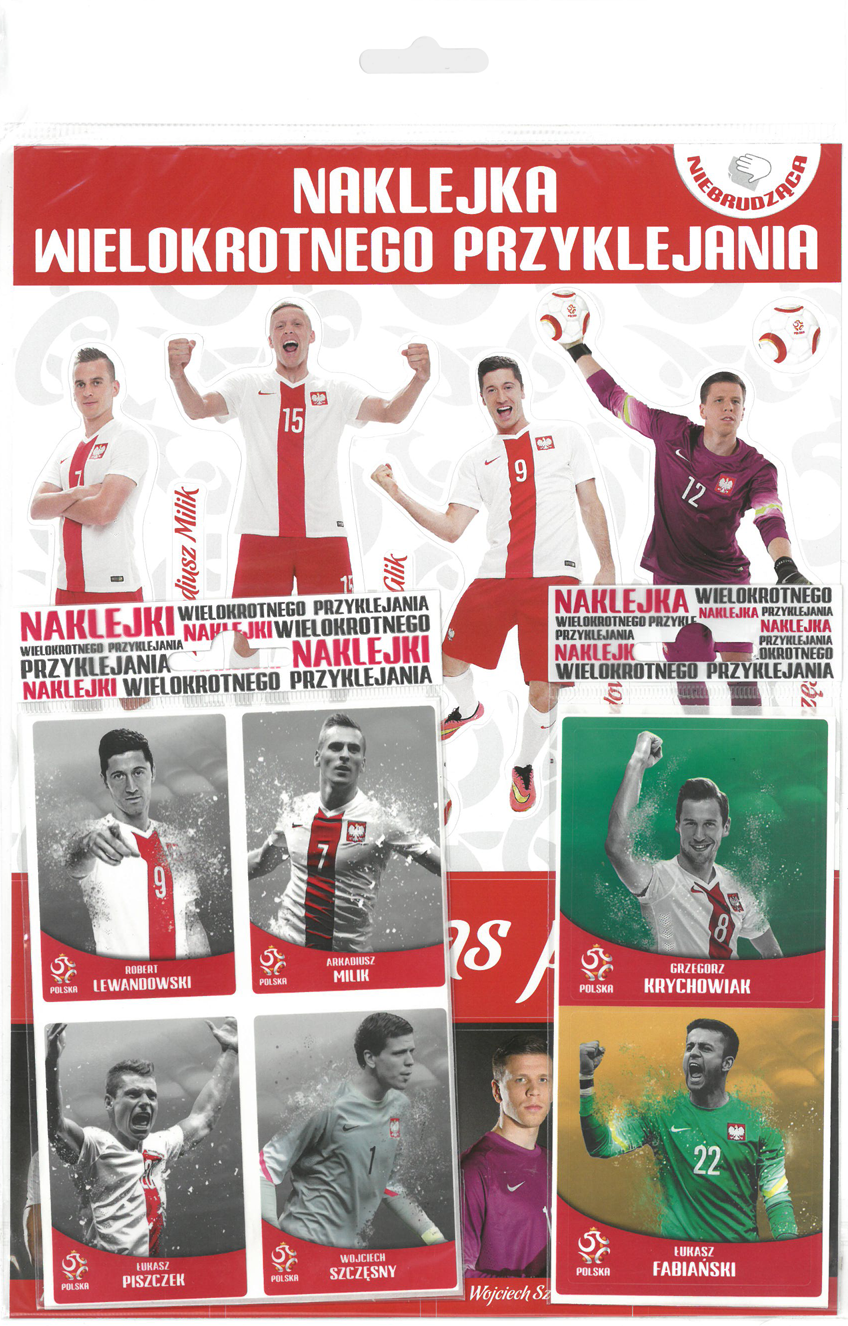 Oficjalny produkt licencjonowany PZPN! Prezentujemy Wam naklejki wielokrotnego przyklejania z wizerunkiem piłkarzy reprezentacji Polski. Naklejki wielokrotnego przyklejania są doskonałym produktem do kolekcjonowania i pasują na każdą gładką, suchą oraz czystą powierzchnię (np. meble, okna, ściany, itp.). Wykonana jest z miękkiej folii PCV. Bardzo dobrze dopasowują się one do podłoża i nie pozostawiają śladów po ich odklejeniu. Naklejka ścienna: arkusz 21 x 29,7 cm