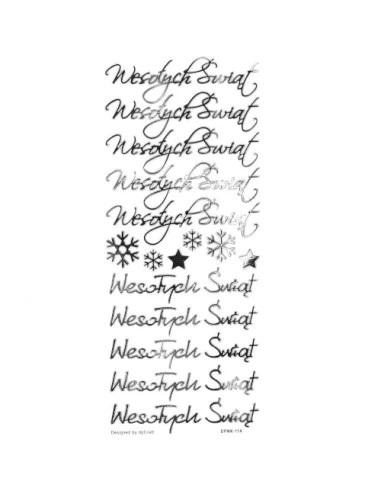 Srebrne naklejki ażurowe z napisami "Wesołych Świąt" w dwóch ozdobnych czcionkach oraz gwiazdkami i śnieżynkami w kilku rozmiarach. Idealne do ozdabiania kartek okolicznościowych, karnetów, zawieszek, opakowań prezentów, dekoracji albumów, świec, szkła,