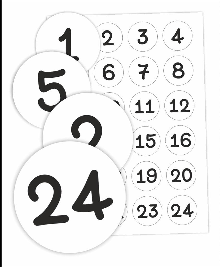 Zestaw składa się z 24 naklejek z cyferkami o średnicy ~ 40 mm.