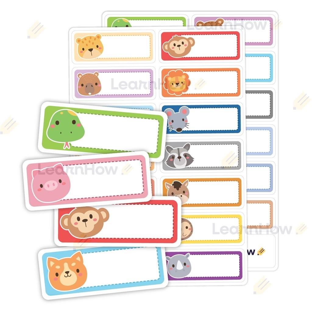 Na każdej naklejce znajduje się inne zwierzątko, inny kolor tła, oraz miejsce na wpisanie imienia dziecka.