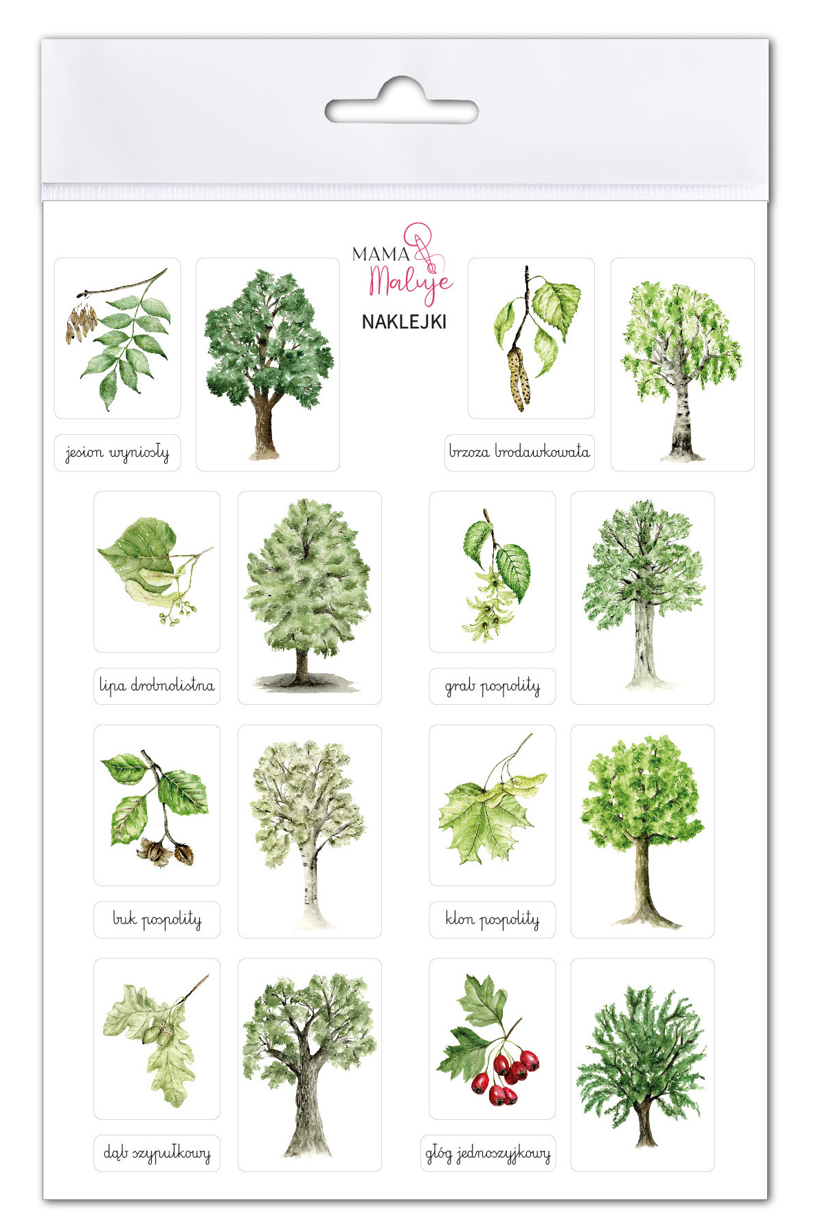 Wszystkie gatunki zawierają podpisy, dzięki czemu nikt nie będzie miał problemów w ich rozróżnianiu. Na odwrocie arkusza znajduje się wykaz przedstawionych na naklejkach drzew i ich owoców.
