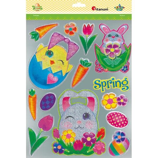 Naklejki foliowe metaliczne: napis Spring, zające i kurczaczek w pisankach, marchewki, pisanki, kwiaty, 14 sztuk.