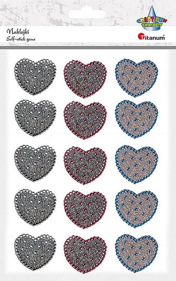 Naklejki przezroczyste foliowe. Wzór: serca, kolory: srebrny, różowy, niebieski, wymiary: 42 x 38 mm.