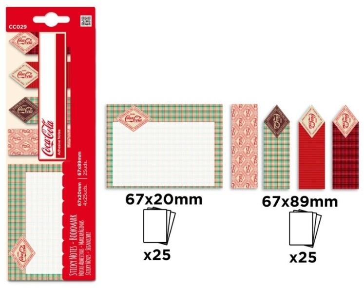 Wymienne karteczki samoprzylepne z motywami Coca-Coli w stylu vintage. Opakowanie zawiera: 25 banknotów o wymiarach 67 x 20 mm i 4 bloczki po 25 banknotów o wymiarach 67 x 89 mm. Vintage projekty Coca-Coli. Oficjalna licencja.