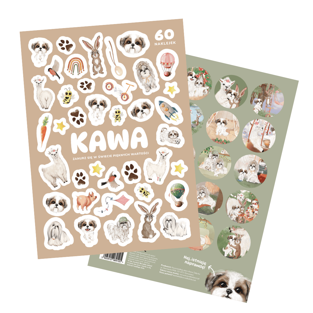 Naklejki stworzone na podstawie ilustracji Magdy Pakiet do serii książek Kawa dla dzieci autorstwa Anny Załęckiej.