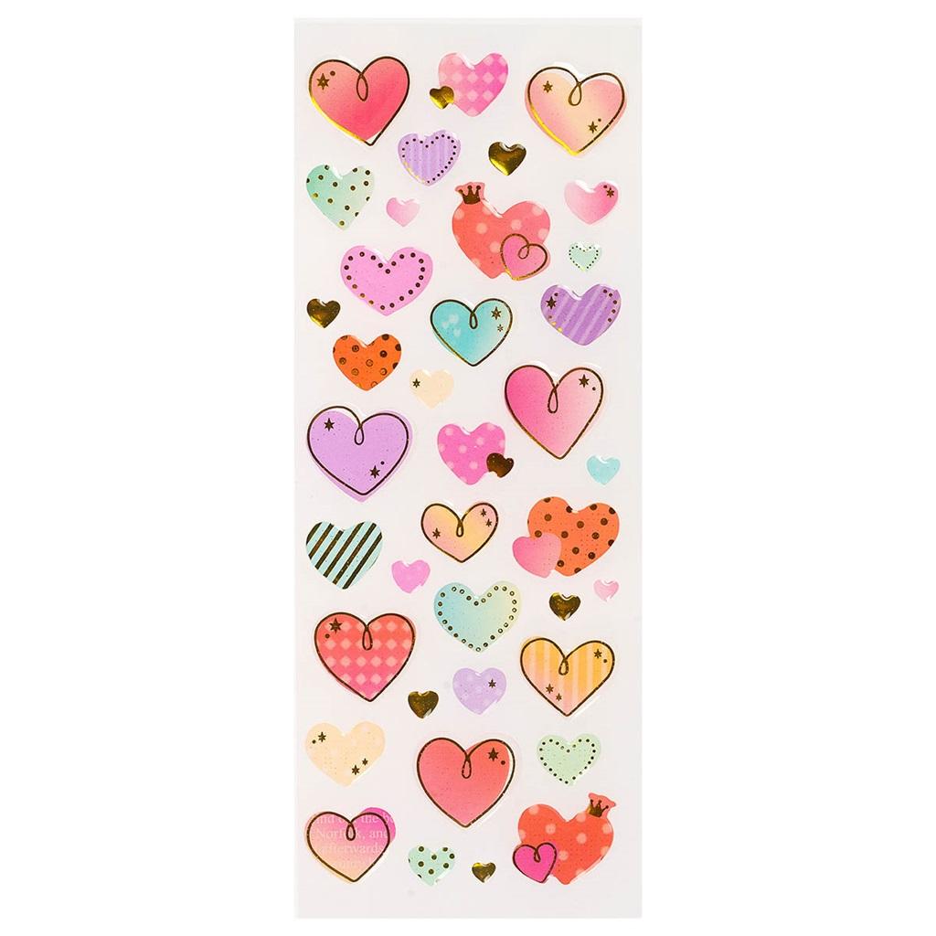 Plastikowe naklejki w kształcie serduszek ze złotymi dodatkami. Wymiar arkusza: 7x17 cm.