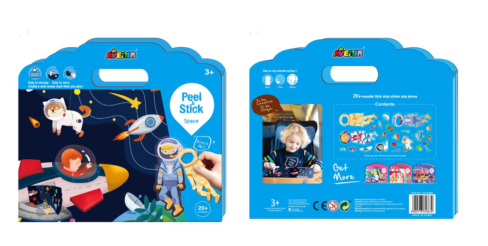 Naklejki mają piękne kolory, a do tego znajdują się w poręcznej teczce z planszą do zabawy - wystarczy otworzyć, by ukazał się kosmiczny bezkres, na który można naklejać bez limitów! Naklejki są bezpieczne, ponad 20 naklejek do wielokrotnego naklejania. Nie zostawiają śladów.